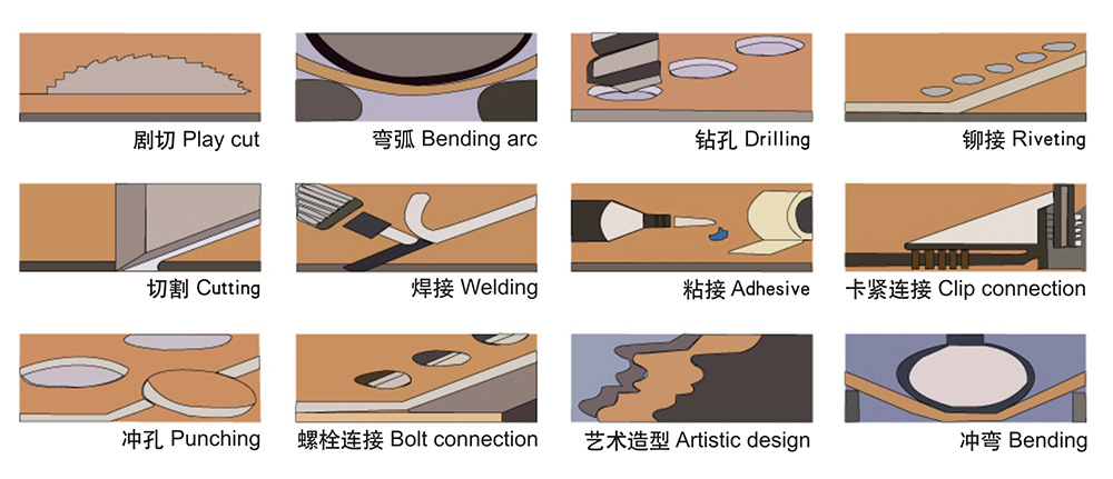鋁塑板可以使用金屬和塑料加工常用的連接方法連接,下面介紹幾種常用的連接方式。